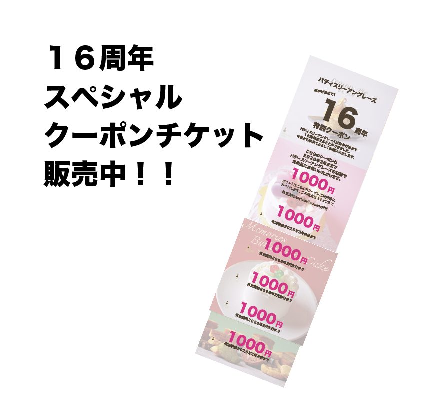 アングレーズは16周年を記念しまして来年3月末までお使いいただける6000円分のお買い物券を5000円で販売しております! お誕生日や記念日でケーキを予定されているお客様にはとってもお得なクーポンチケットになっています! […]